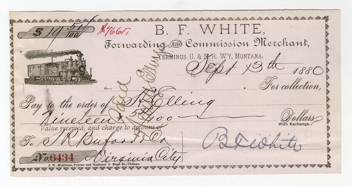 Montana. B. F. White Forwarding and Commission Merchant, Cancelled Check for $19.54, VF to XF condition.