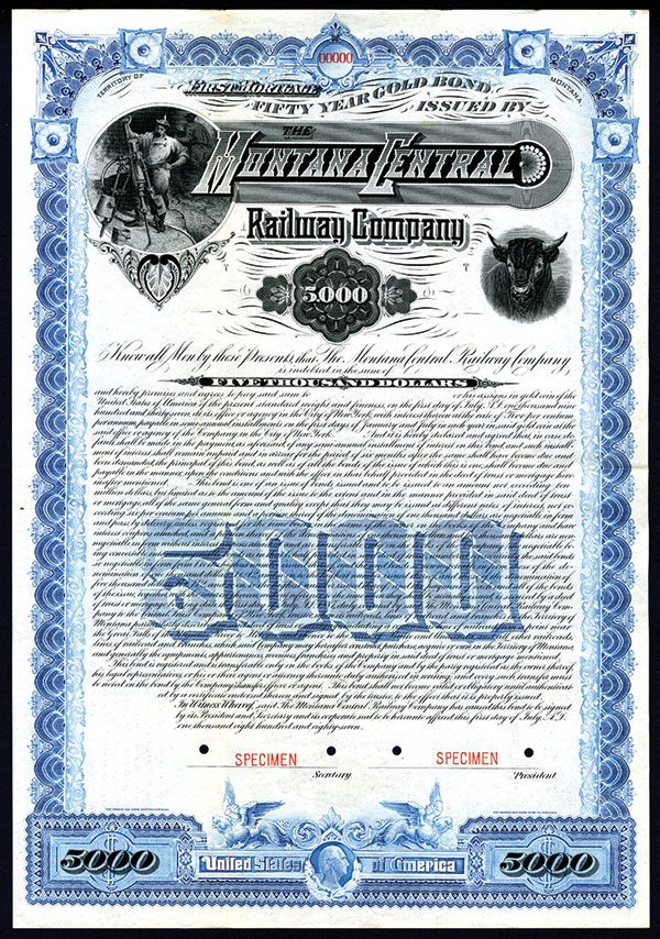 Montana Territory. $5000 Specimen 1st Mortgage 5% Gold Bond. Blue border. Miner in circle on left, bull on right with ornate border. Red specimen overprints, POC's and “00000” serial numbers. Coupons attached. VF condition. HLBNC. Rare certificate. A trophy for the Montana Collector.