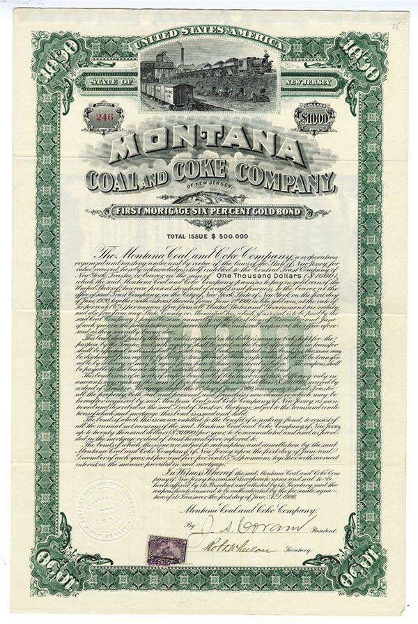$1,000 I/U 6% 1st Mortgage Gold Bond, XF, Montana Coal & Coke Company owned coke ovens and several mines to provided power for lighting and mine equipment.