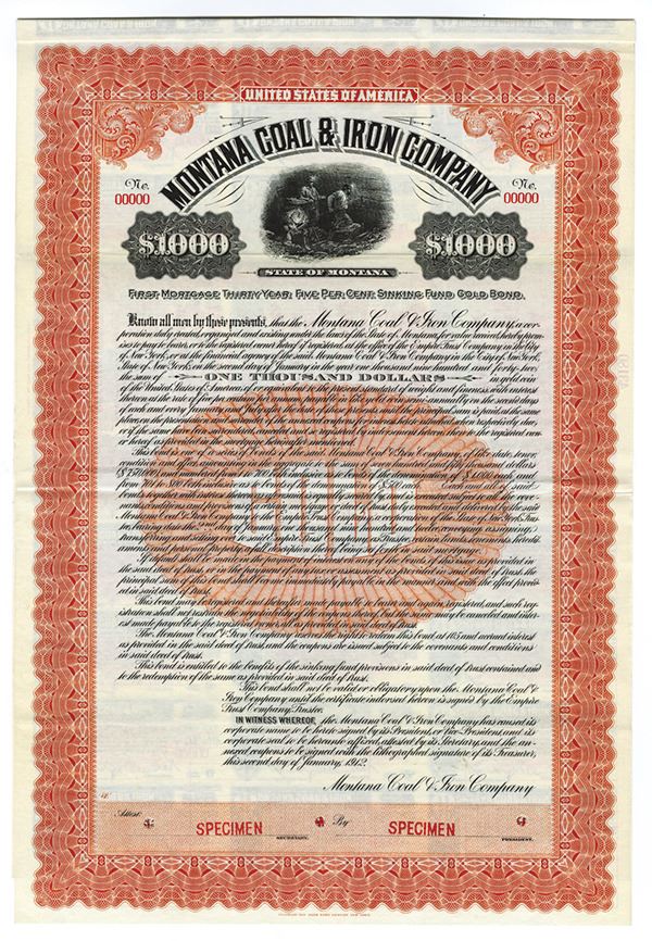 Montana, 1912, $1000, Specimen 5% Gold Coupon bond, Miners, Blue, Coupons attached, POC's, VF. ABNC.