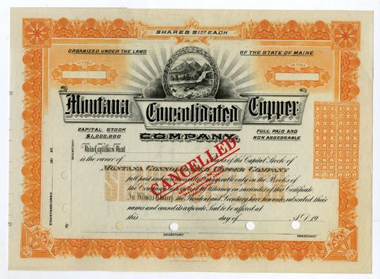 Montana, (Inc. in Maine), ND (1900s). Specimen Stock Certificate, Black on orange border and underprint, Mountain range at top, Cancelled overprints and POCs, XF-AU condition, SBNC.