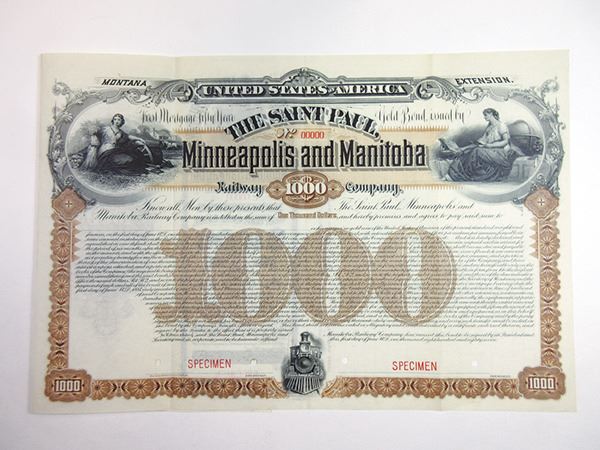 Montana Territory and Minnesota. $1000, Specimen 1st Mortgage 4% Registered Gold bond. Brown & black borders. Allegorical women on left and right with train heading directly forward on bottom middle. XF condition. Red specimen overprints, POC's and "00000" serial numbers. No coupons attached. Extremely rare Montana Railroad certificate.
