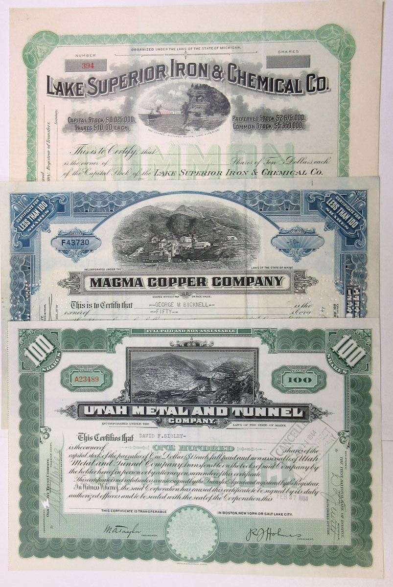 Attractive assortment of I/C Stock Certificates, Includes Anaconda Copper, Peabody Coal and many others, All are ranging from VF-Fine condition, 6 Pieces.