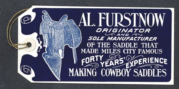 Miles City, Montana. Label for Al Furstnow Saddlery Co. Nice image of saddle. NOS.