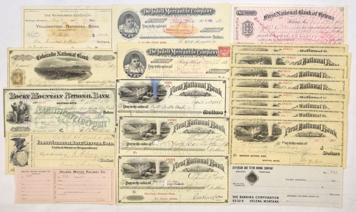 Montana & Colorado..., 1870-1910s. Lot of 20 Issued bank and commercial checks representing early Montana banking, mining, and mercantile history. Includes multiple examples from First National Bank of Helena; Rocky Mountain National Bank; Yellowstone National Bank, Billings; Colorado National Bank; First National Bank, Denver; The Isdell Mercantile Co.; Musselshell Cattle Co.; Helena Motor Railway Co.; and Jefferson and Teton Mining Co., among others. Designs feature mining and waterfall vignettes, frontier scenes, engraved portraits, and ornate Western typography. Condition ranges from Fine to Very Fine overall, with folds, punch cancellations, edge wear, and normal banking markings. (20). Sold “AS IS” no returns accepted.