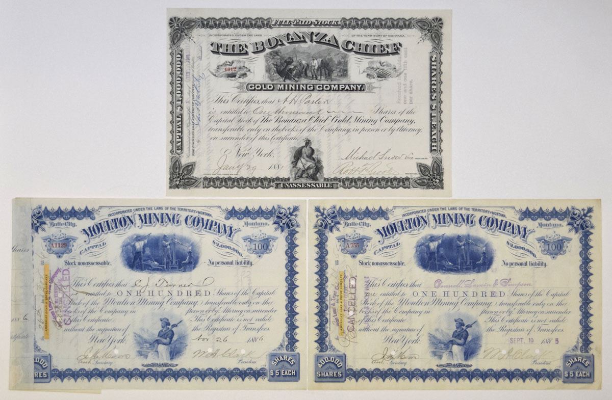Montana Territory..., 1881-86. Lot of 3 I/U and I/C Stock Certificates, Includes: 1881, Bonanza Chief Gold Mining Co., 1000 Shares I/U Cert; 1885, Moulton Mining Co., 100 Shares I/C Cert; 1886, 100 Shares I/C Cert. Condition ranges from VF to XF and all were printed by ABNC. (3). Sold "AS IS" no returns accepted.
