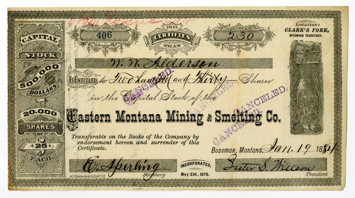 Montana Territory, 1884. 230 Shares Capital Stock I/C Certificate, Black print with simple black border, Mining vignette at right side with company title at lower center, S/N 406, Location of Mine was Clark's Fork in Wyoming Territory, Multiple Cancelled stamps on face, VF to XF condition.