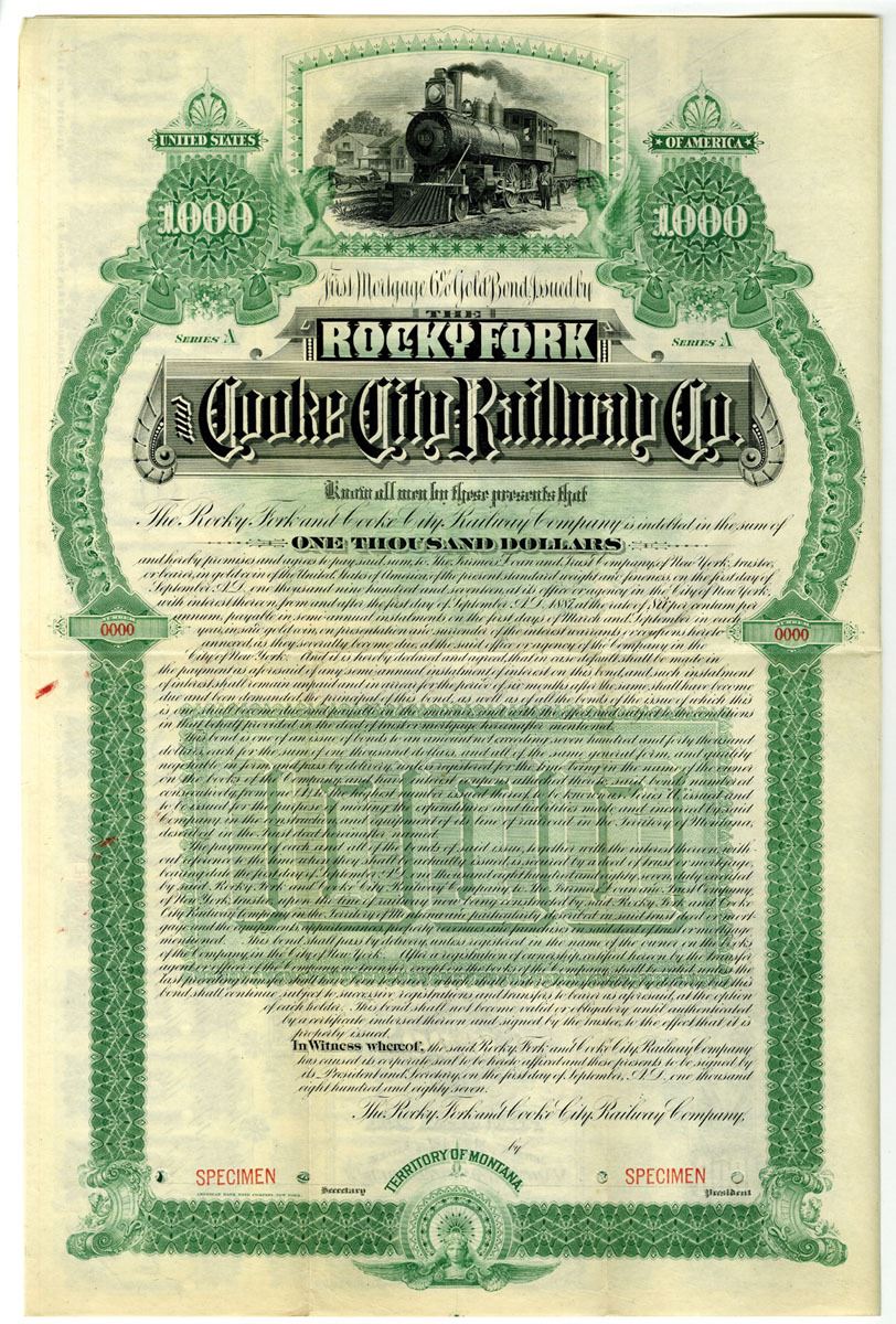 Montana Territory, 1887. $1000 Specimen 6% First Mortgage Gold Coupon Bond, Black text with green border and undertint, Man standing beside passing train at top center. Red specimen overprints, 0000 serial numbers, POCs. VF condition, ABNC. Unlisted in bond format in Cox, 2 examples found in the ABN Archives in 2002, this is the only example available. Rare and historic territorial railroad certificate.