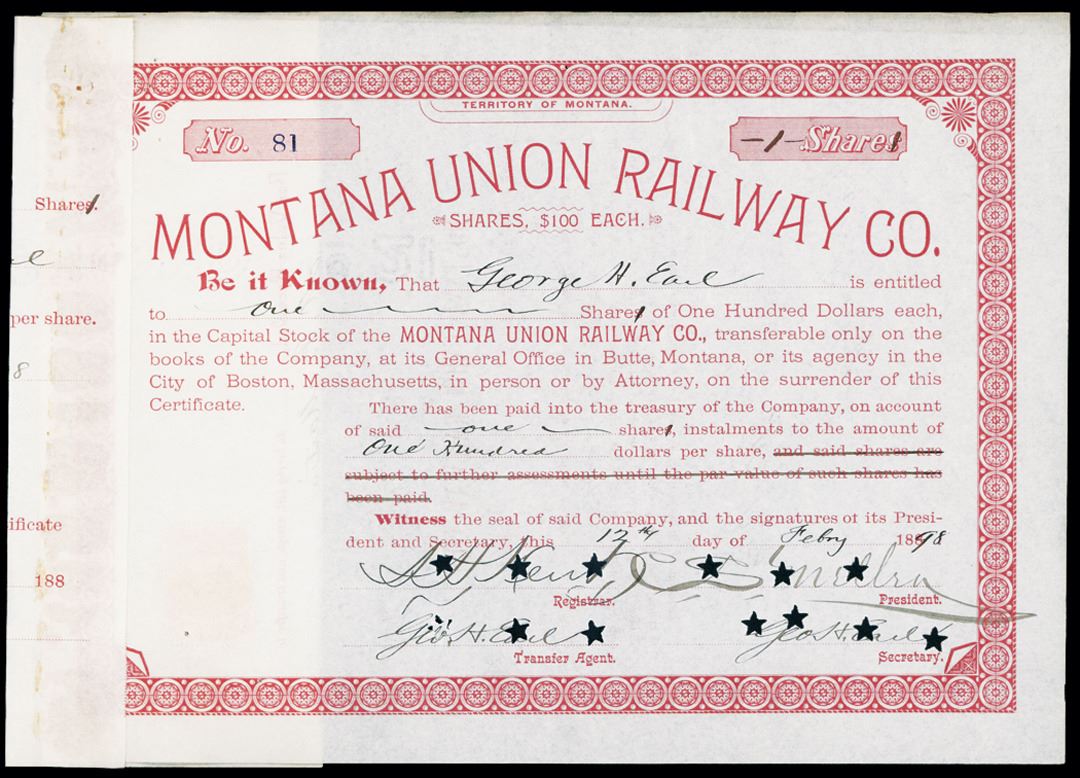Butte, Montana, 1898, 1 Share, Red on white without underprint, Ornate border, no vignette, Cert.# 81, Charles Mellon autograph as president, VF condition. Unlisted railroad in Cox.