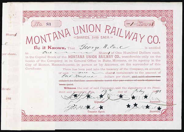 Butte, Montana, 1898, 1 Share, Red on white without underprint, Ornate border, no vignette, Cert.# 81, Charles Mellon autograph as president, VF condition. Unlisted railroad in Cox.