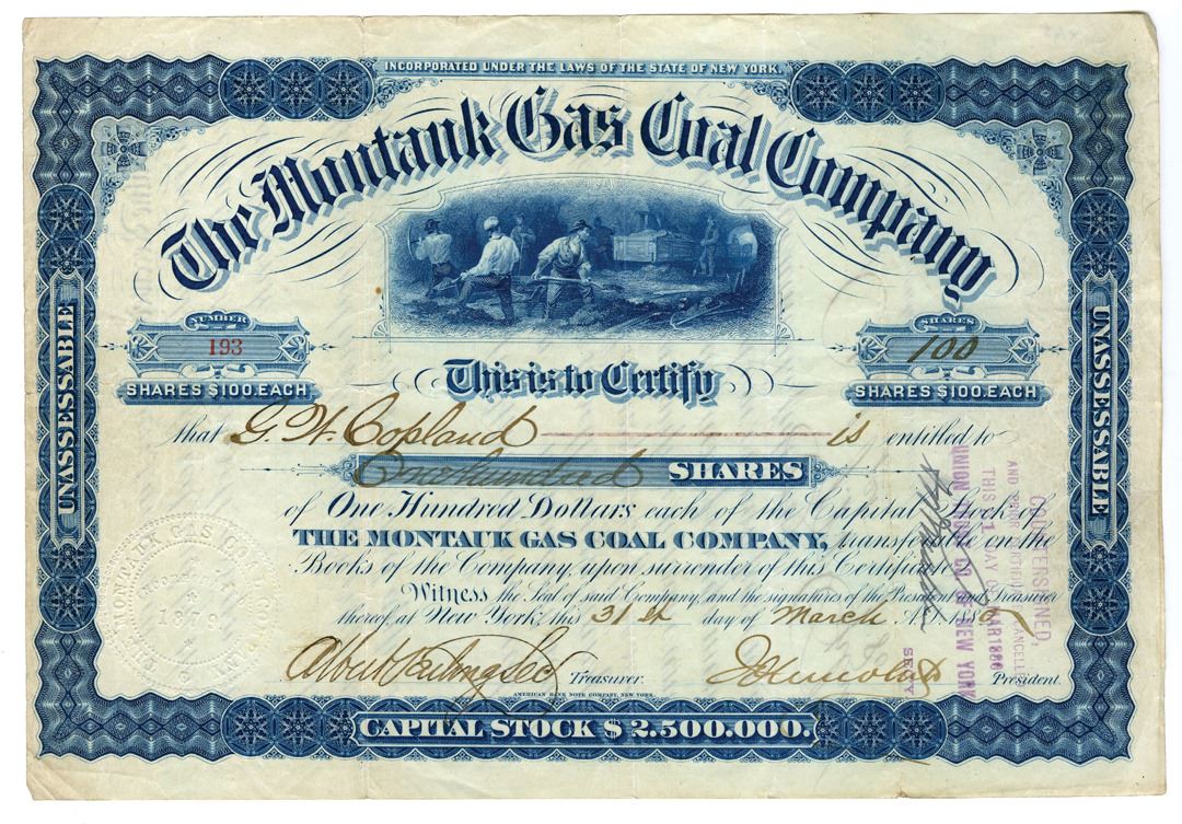 New York, 100 Shares, I/U, Blue printing, mining scene in middle under curved title, S/N 193, VF. ABNC. Rare mining and oil & gas related company as well as early Long Island company.
