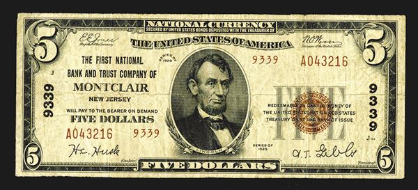 Montclair, NJ. 1929, The First National Bank and Trust Company of Montclair, NJ, Ch# 9339, $5.00 Sm