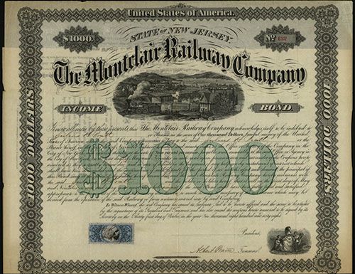 New Jersey, 1868, $1000, 7% Issued and Uncancelled Bond, #132, Coupons attached, Horizontal format, VF condition with minor wear where folding occurred, Lith. of Henry Seibert & Bros. Blue 25cent Washington revenue stamp attached. Railroad listed in Cox but bond in this denomination is not listed.