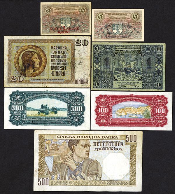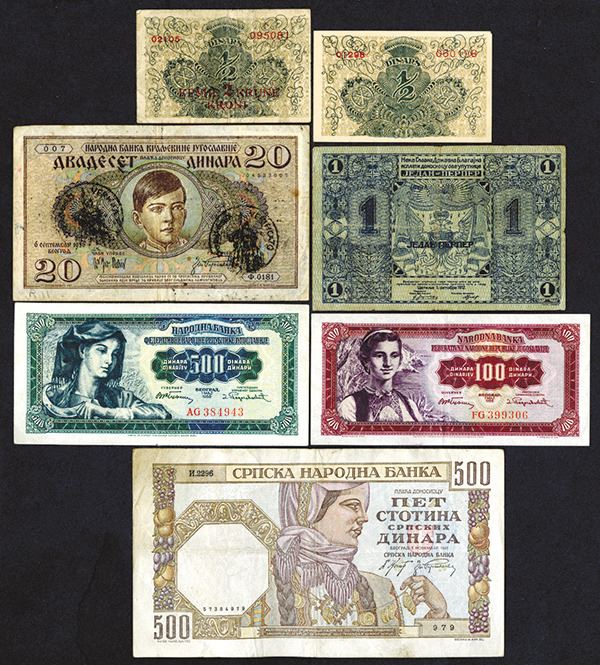 Montenegro. 1 Perper. P-1a, Italian Occupation. 20 Dinara. P-R11 with two hand stamps. ; Serbia. 500 Dinara. P-27b; Yugoslavia. 1/2 Dinara, 2 Kroni. P-11; 14.100, 500 Dinara. 1955. P-69, 70. Mostly Fine or so. 7 pieces.