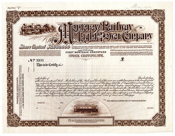 Canada. Odd Shares 5% 1st Mortgage Debenture Stock Certificate, Brown print with brown under tint on large sized certificate, Ornate company title at top next to image of generators, Pin punched Specimen, VF-XF condition, Bradbury Wilkinson & Co.