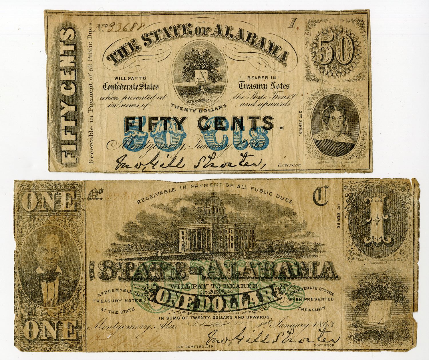 Montgomery, Alabama, Lot of 2 notes, Both are 1863, State of Alabama Issues, 50 Cents, and $1. Both in Fine to Choice Fine condition. (2)