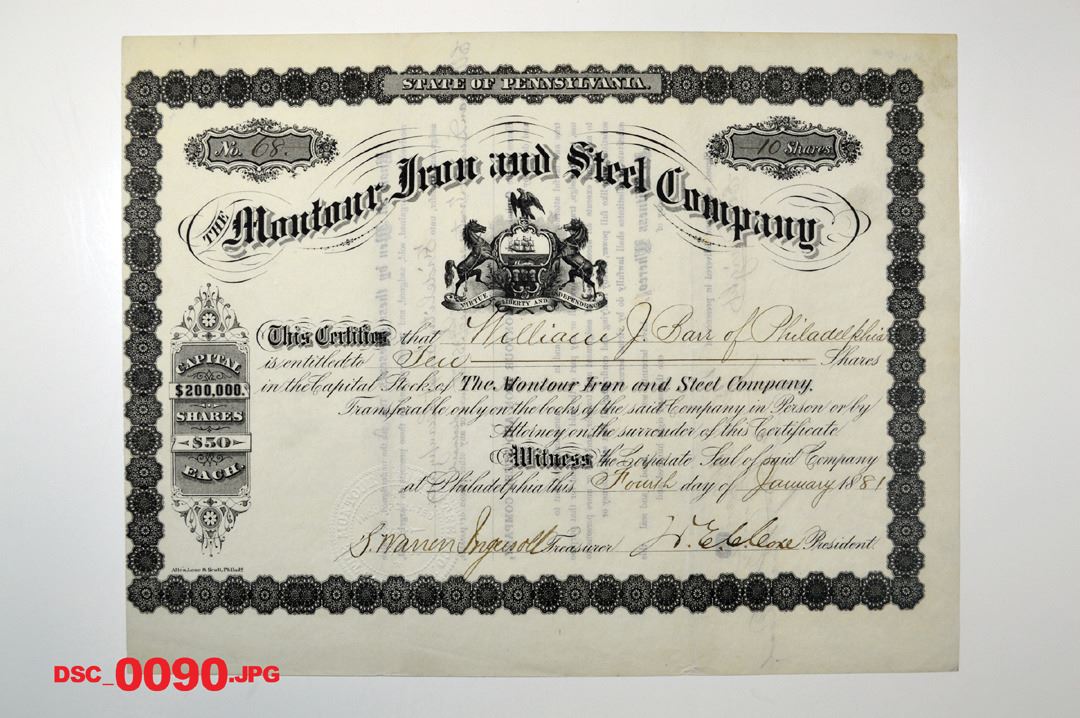 Pennsylvania. 10 Shares Capital Stock I/U Certificate, Black print on black border, Image of Pennsylvania's State Seal at center, VF-XF condition.