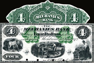 1863. P-S1863 Unlisted. $4 Proof face and back banknotes printed on india paper. Back has green "4" undertints and the back is cut to shape in green. Punch Cancelled. Unlisted as proof. Choice Unc. BABANC.