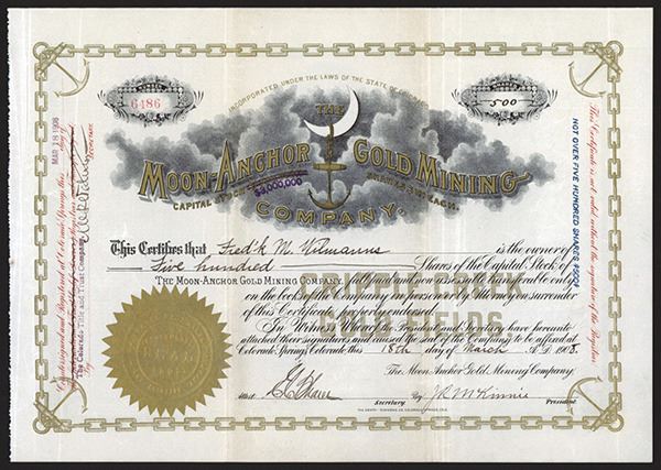 Colorado Springs (Cripple Creek), CO. 1908, 500 Shares, Issued Stock, Black on gold anchor chain border with anchors on corners and one harnessed to the moon top center, VF-XF condition, The Gowdy- Simmons Co.