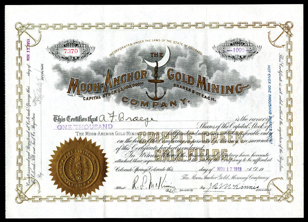 Delaware, 1913, 1000 Shares, Issued Stock, Black on gold border and underprint, Anchor harnessed to the moon top center with anchor chains as borders, XF condition. Scarce and very attractive Cripple Creek Mining Stock.