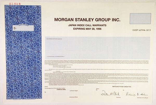 Delaware, 1994. Odd Shares Specimen Japan Index Call Warrants, Black text with blue border and left and undertint. Specimen POCs, VF condition, SC-USBN. Morgan Stanley is an American multinational investment bank and financial services company.