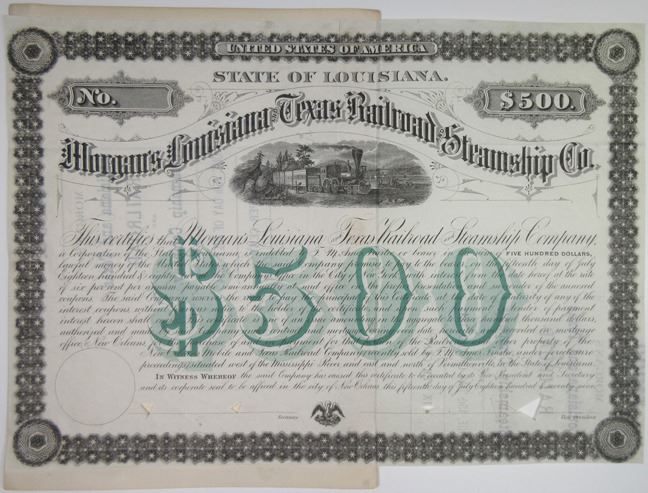 New Orleans, Louisiana and Texas, 1879. $500 Specimen 6% Coupon Bond, Black text with black border and green underprint with train at center passing along river scene under curved title. Cut-out cancellations on signature lines at bottom, Fine-VF condition. Incorporated April 1, 1878, as successor to the New Orleans, Opelousas and Great Western. About 1883 the Morgan's Louisiana and Texas Railroad and Steamship Company came under the influence of Central Pacific management and on March 1, 1885, was leased to the Southern Pacific Company, but was operated as a separated company until title transferred to the Texas and New Orlean on March 1, 1927. The road had about fifty locomotives, which, in 1884, went into the T&NO roster, although the initials ML&T, indicating corporate ownership, remained on the engines until 1916. Rare and possibly unique bond and it is the same (and possibly only) example pictured in Cox.