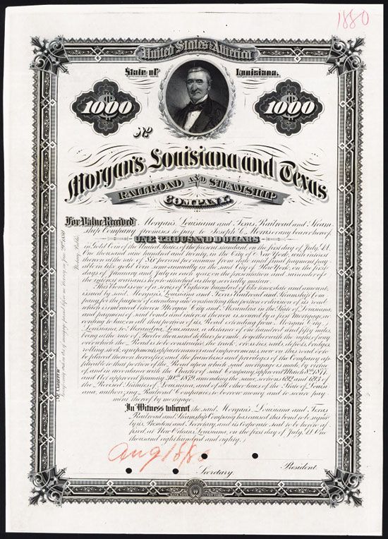Louisiana & Texas, 1880, $1000, 6% Gold Bond, Vertical Format Bond Proof, Black print and border, Portrait of Morgan top center, VF condition, ABNC. Listed railroad and bond proof in Cox.