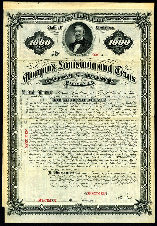 Louisiana. 1880. $1000 6% Specimen Bond. Black print with black ornate border and underprint. Portrait of Charles Morgan top center . POC's and red SPECIMEN overprints. VF condition with minor splitting and some small pieces missing on borders. ABNC. Listed railroad and bond in Cox.