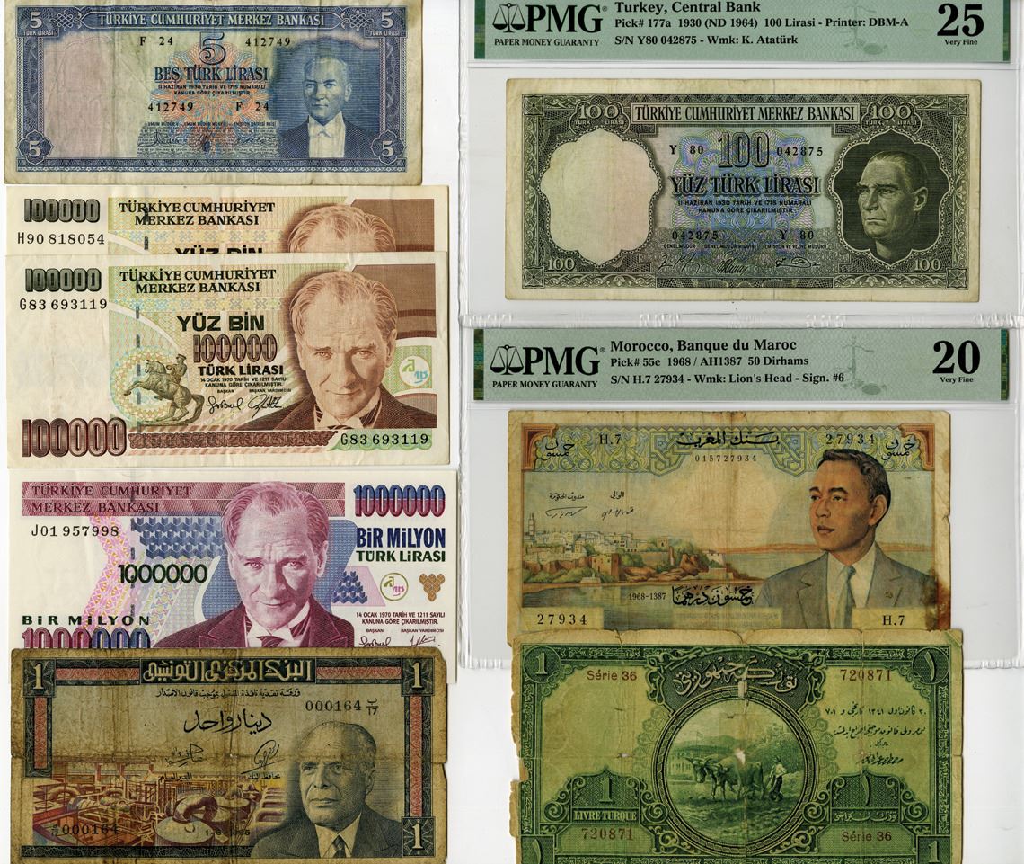 Morocco, Tunisia, Turkey, 1926-99. Lot of 8 Issued Banknotes, Includes: Banque du Maroc, 1968/AH1387, 50 Dirhams, P-55c, PMG graded Very Fine 20 with comment "Thinning," Banque de France; Banque Centrale de Tunisie, 1965, 1 Dinar, P-63a, Note is in Good to Fine condition, TDLR; State Notes of the Ministry of Finance (Turkey), L.1341 (1926), 1 Livre, P-119a, Fine condition with the note nearly split in half and repaired with tape and stamp hinges, TDLR; Central Bank of Turkey, 1964 to 1999, 5 Lira, P-174a, DBM-A; 100 Lirasi, P-177a, PMG Very Fine 25, DBM-A; 100,000 Lira, P-205c (2); 1,000,000 Lira, P-209a, Ungraded notes range from Choice Fine to XF condition. (8). Sold "AS IS" no returns accepted.