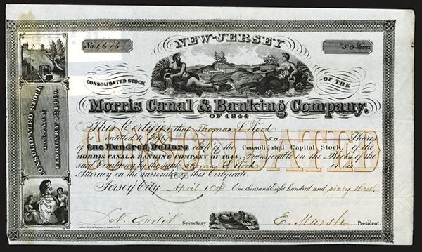 Jersey City, NJ, 50 Shares, I/Cm Black with light brown underprint, allegorical man and woman on top, counterfoil on left, Fine. LB&S.