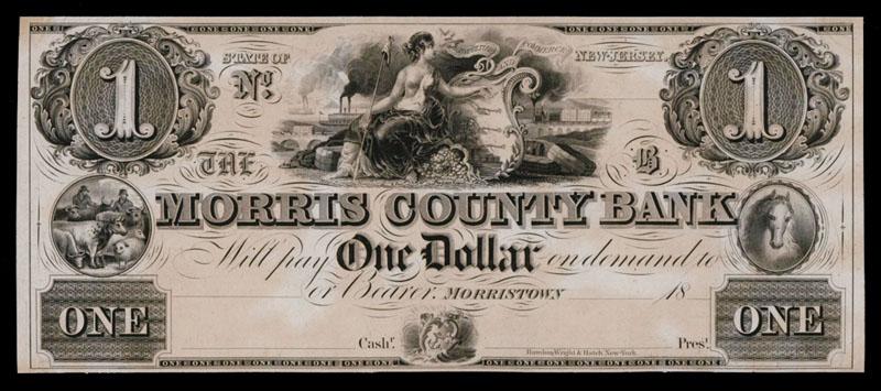 Morris County Bank, ca.1830's Obsolete Proof.Morristown, New Jersey, 18xx (ca.1830's), $1, Plate B, NJ-315-Unlisted Design, Unlisted in census, Proof banknote, Banknote printed in black on india paper, Partially Topless Allegorical woman sitting on cornucopia with New Jersey Arms in middle, Drovers with cattle and sheep on left, horse on right, Small areas of glue staining from previous mounting, XF to AU condition with light toning, Rawdon, Wright & Hatch, New York imprint. (Silver City Collection, Part 1)