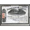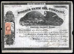 Pennsylvania. 1865. 200 Shares, Cert.#11, Black Border, Large vignette with train, barges oil barrels and forest in middle with smaller vignette covered by revenue stamp. Issued and uncancelled. Fine condition with edge faults and toning on top margin. Scarce Pennsylvania oil company.