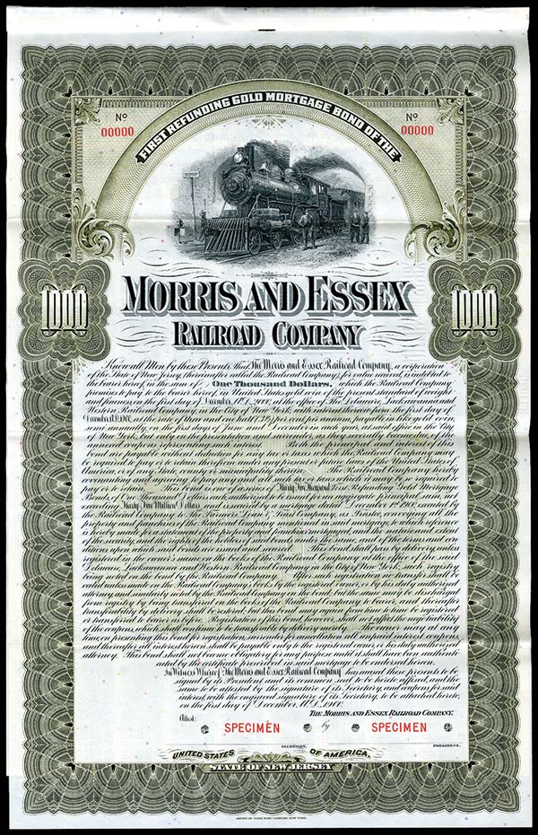 Morris and Essex Railroad Co., 1900, $1000 Specimen Bond. New Jersey, 1900, $1000 3 1/2% 1st Refunding Gold Mortgage Specimen Bond, Black on olive border and underprint, POC's and red SPECIMEN overprints, VF condition, ABNC.