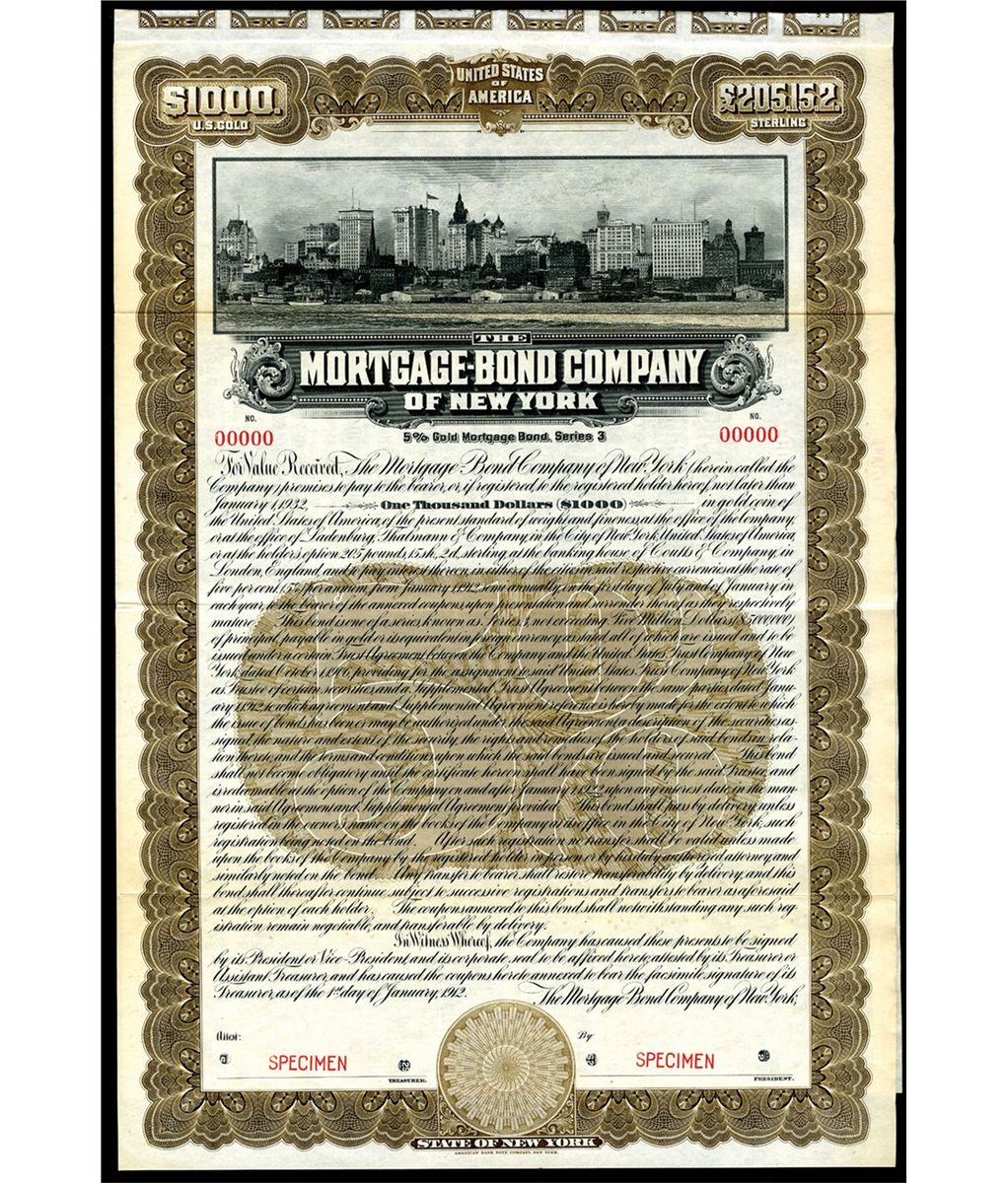 $1000 - 205 Pounds 15Shlg/2P. 5% Gold Mortgage Bond, Series 3. Amazing early NYC skyline on top. Brown border and undertint. Coupons attached. POC. ABNC. XF condition. Rare and attractive bond.