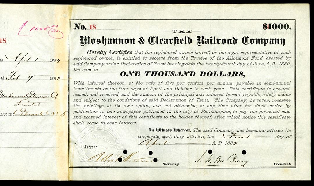 Philadelphia, Pennsylvania, 1882, Moshannon & Clearfield Railroad Co. $1000, 5%, Bond Certificate, Plain form, VF Condition. S/N 18.