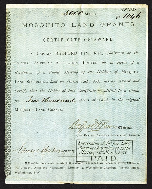 Nicaragua. 1868, 5,000 Acres. Captain Pim, who signs as Chairman of the Central American Association, was an Arctic explorer and adventurer who later became involved in promoting an Interocean railroad route across Nicaragua. VF+.