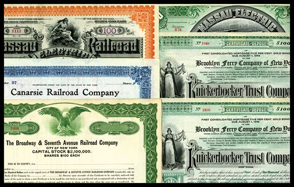 Mostly Brooklyn Railroad Bonds &Shares, Lot of Seven 1890's to early 1900's. NY. Brooklyn Ferry; Nassau Electric. Railroad; Broadway & Seventh Ave., Canarsie Railroad. The last two unissued. Nice, colorful grouping. Mostly XF. (7)