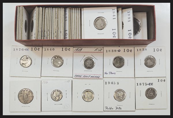Mostly Condition Challenged U.S. Type Coin Grouping. Culls (worn, damaged, most with dates) - Nickel Three Cents(3); Three Cents Silver(5); Bust Half Dime; Liberty Seated Half Dimes(5); Bust Dimes(8); Liberty Seated Dimes(21). Also included – Nickel Three Cents F-VF(5); Three Cents Silver VG(2); Liberty Seated Dimes 1857-O VG, 1875-CC Above Bow Fine, 1876-CC AG; 1891 VF; Liberty Seated Quarters 1861 VG; 1876 Good; Liberty Seated Halves 1858-O VF, lightly cleaned, 1847-O VG; Trade Dollar 1876-S Fine, rim nicks; 1893 Columbian Expo Halves VF(3); Plus a few other surprises. [65+], weight approximately 1.5 lbs.