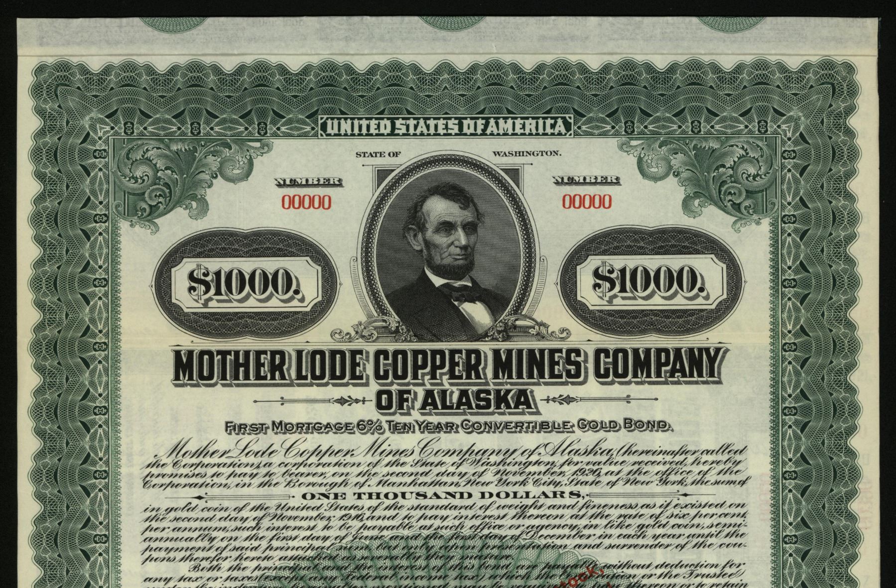 Alaska (Inc. in Washington), 1916, $1000, 1st Mortgage 6% 10 Year Convertible Gold Specimen Bond, Vertical format, Coupons attached, Lincoln portrait top center, POC's , VF condition, FL-ABNC. Red overprint regarding conversion option being waived. The Mother Lode mine produced 1,216,000 tons of ore containing 12.39 percent copper. The Mother Lode Mine was located in Kennecott, Nizina District, Valdez-Cordova Borough, Alaska, USA. Rare Alaska bond with only 3 examples found in the ABN Archives.