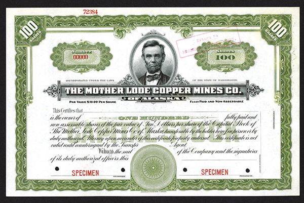 Green border, Abraham Lincoln portrait in oval frame, 100 shares Specimen, ABNV, EF.