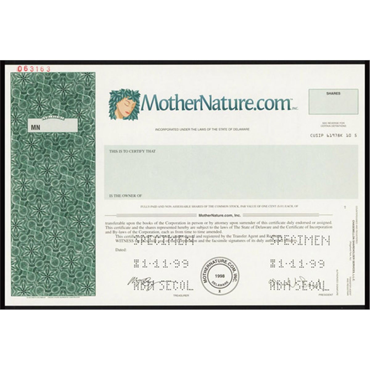 1999, Specimen, Odd Shares, Mother Nature logo, Green end panel, Pin punch cancels, XF. Online health and beauty internet store.