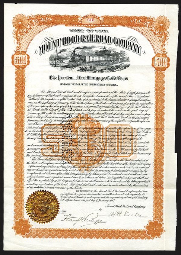 Utah, 1907, 6% 1st Mortgage Cold Coupon Bond, Locomotive passing telephone pole, POC, coupons removed, gold foil seal, VF.