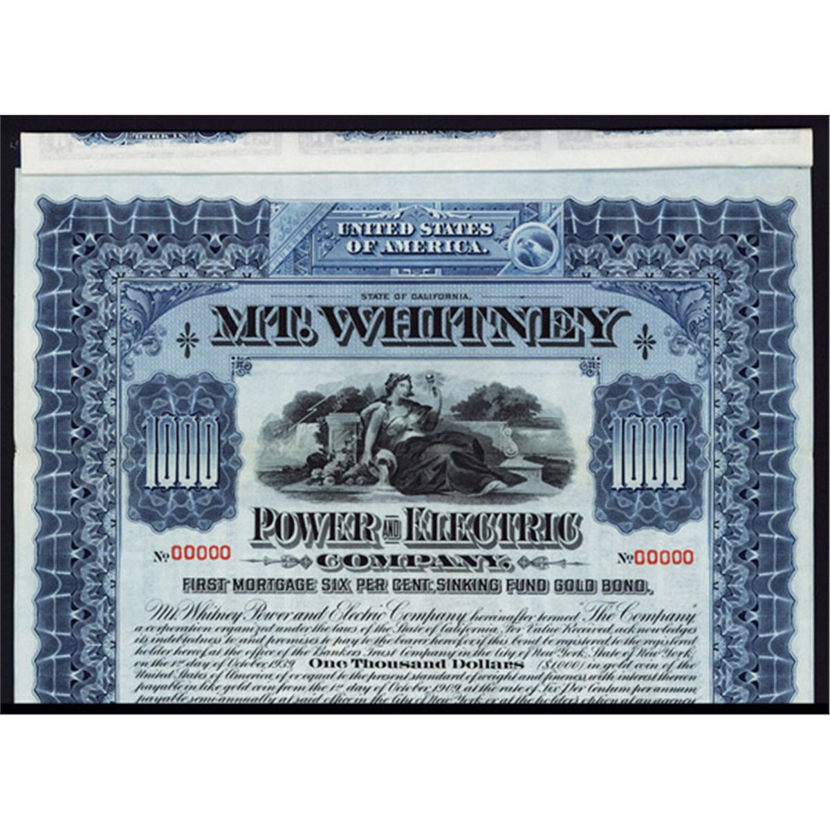 California, Mt. Whitney, 1909, $1000 bond, Specimen, Reclining woman with water jar and electric torch, Blue, POC's, XF.