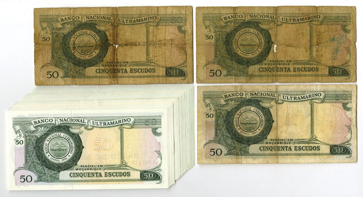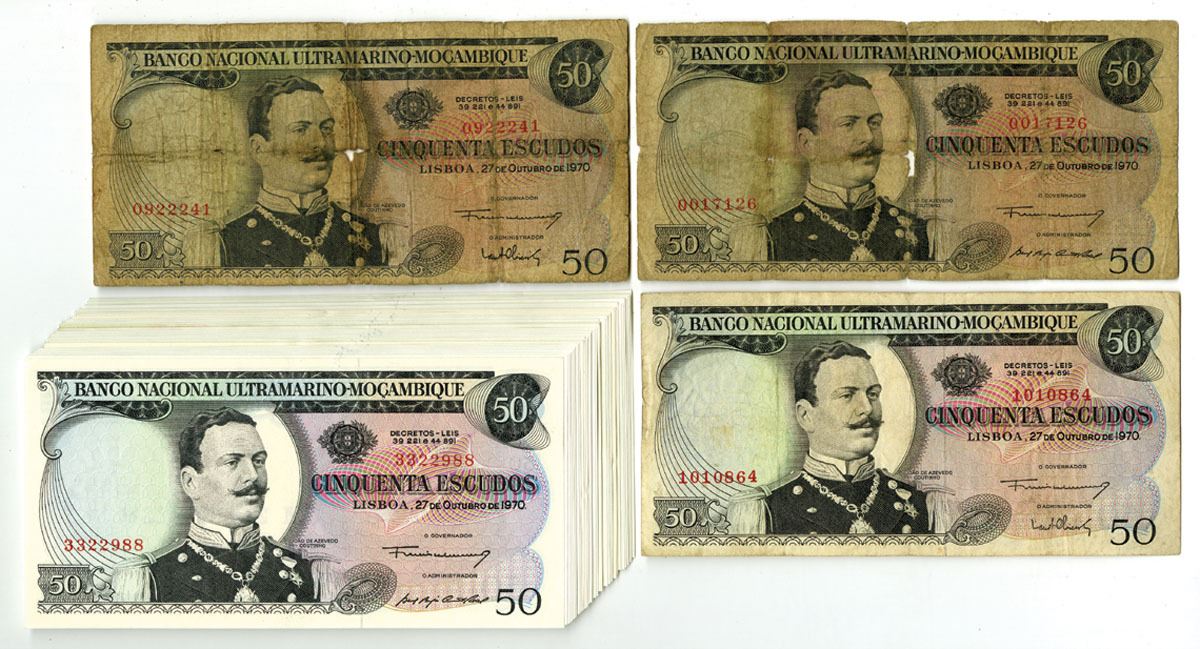 Mozambique, 1970-76. Lot of 47 Issued Banknotes, Includes: Banco Nacional Ultramarino-Mocambique, 1970, 50 Escudos, P-111 (4); Banco de Moçambique, ND (1976 - Old Date 1970), P-116 (43), Overprint on P-111 (Mostly in Choice AU to CU condition). Banknotes range from Fine to CU condition. (47). Sold "AS IS" no returns accepted.