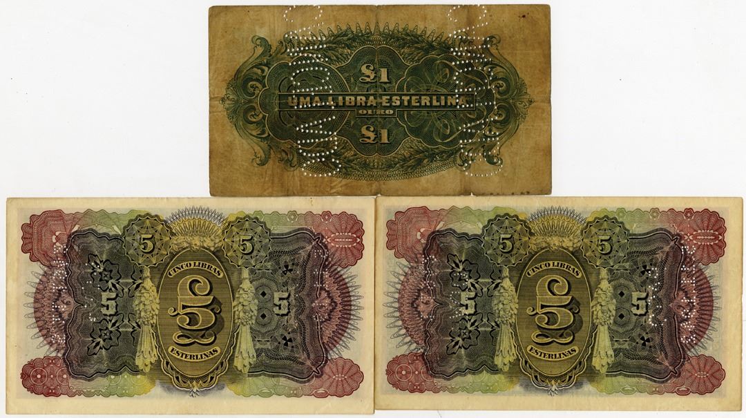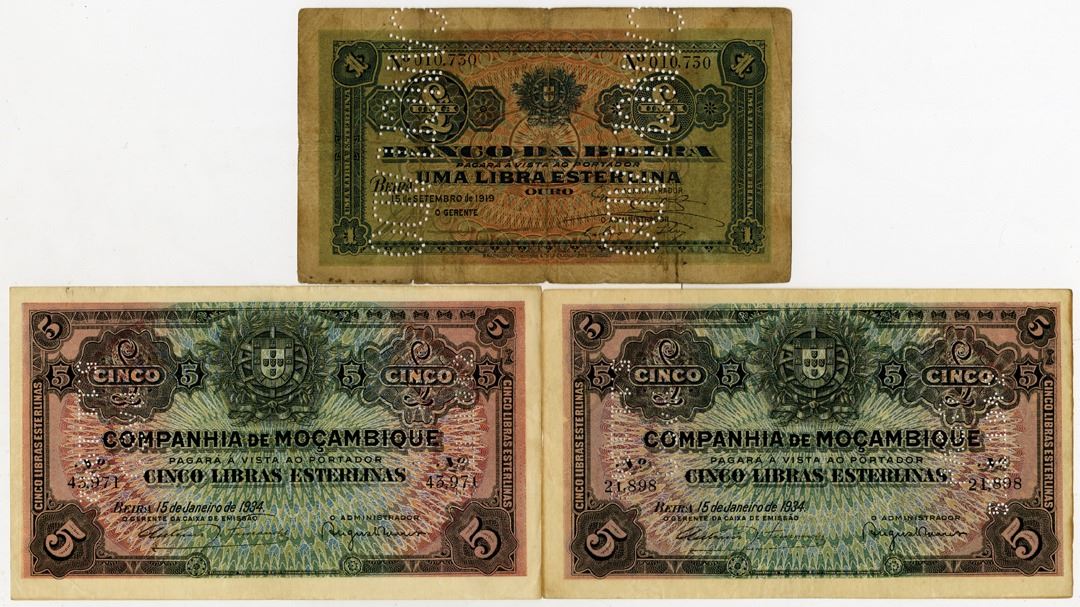 Mozambique, Lot of 3 pieces: Banco da Beira: 1919 1 Libra, P-R6c, Issued banknote, Blue on multicolor; Companhia de Mocambique, Beira: 1934 (punched date is 1942) 5 Libras, P-R32, Issued banknote; and 1934, 5 Libras, P-R32. All printed by BWC. (3)
