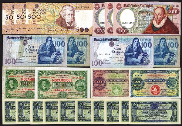 This collection features a nice group of early Mozambique issued notes, includes a consecutive run of 10 uncirculated 20 Centavos 1933 notes issued by Banco de Beira (P-R29), 10 and 20 Centavos of 1914, both nice VF, as well as two 1 Escudo notes from 1941 (P-81), one F and on VF. The rest includes 500 Escudos (P-177, 3 pcs), 100 Escudos (P-178, 4 pcs), and 500 Escudos (P-180, 4 pcs) generally VF.