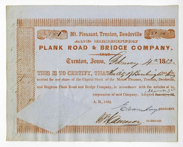 Trenton, Iowa. 1 Share Capital Stock Issued Certificate, Red print on red border on blue paper, Company title at top, Fine-VF condition.