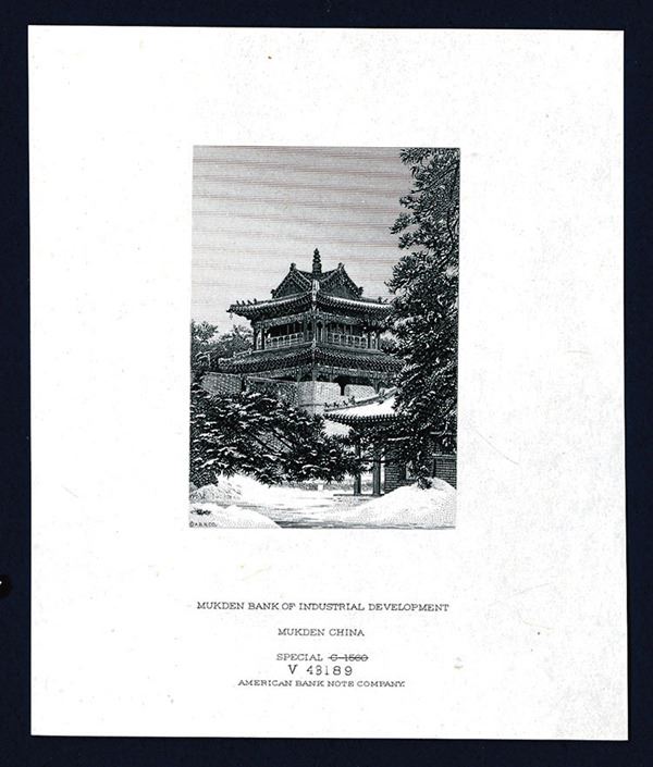 Mukden, China, Proof vignette of Tower used on the $5, P-S1324, This portrait was used on the face of the note. Printed in black on india paper, 3.2 x 4.75 inches, imprint on bottom states ÒMukden Bank of Industrial Development - Mukden China -Special - V 43189 - American Bank Note. CompanyÓ, CU to Gem condition. Rare production proof from ABN Archives. ABNC.