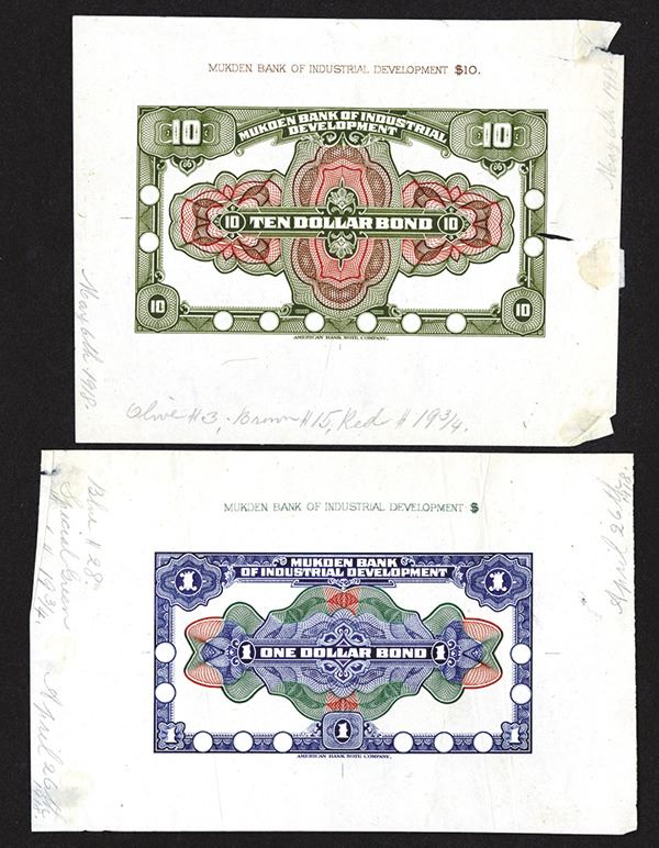 China, 1918-1919 Bond issue. 1918. P-S1323, $1 Bond proof in blue and m/c but issued in green and m/c; P-S1325, $10 Bond proof in olive green and m/c but issued in brown and m/c. Both are printed on india paper. Small pieces are missing from the corner of the $10 note from previous mounting. AU to uncirculated but the $10 has a 1 inch tear on the right middle margin. Each note is unique in archive. Both have archival production notation of colors chooses and date, ABNC.