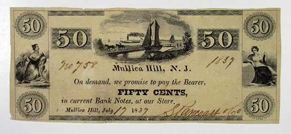 Mullica Hill, NJ. 50 cents, July 17, 1837, Issued scrip note, Wait 1351, R-6. Sailing ship being pulled in canal or river, allegorical women on left and right. S/N 758, VF-XF. Scarce note that is sure to attract attention.